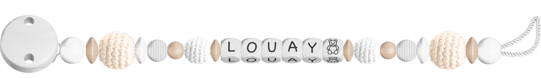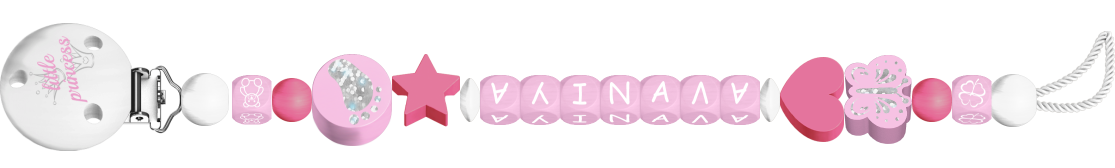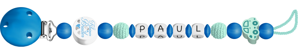 Klik voor klik met veel plezier een fantastisch speenkoord met naam ontwerpen: Met onze generator creëer je in een handomdraai je eigen speenkoord met naam. Onze online-configurator voor speenkoorden is kinderlijk eenvoudig in het gebruik. Voeg steeds met één klik je favoriete knutselmateriaal kraal voor kraal toe aan de grafisch weergegeven speenkoord: van houten clips, houten kralen en schattige motiefkralen tot letterkralen.